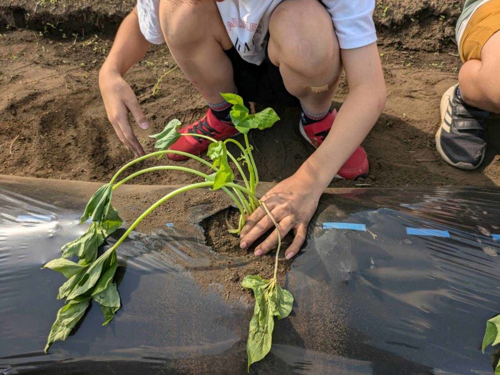 さつま芋の苗植えをしました。秋の収穫を楽しみにしながら大切に土をかけていました。