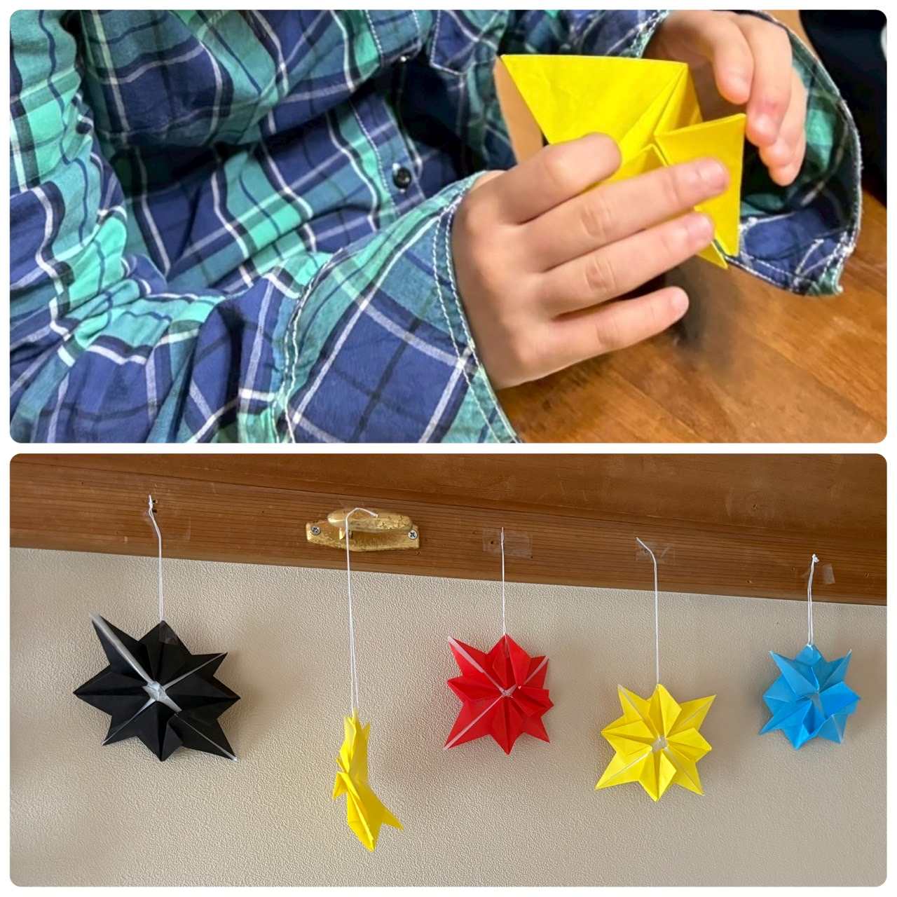 三角、四角、丸つなげをしたりして短冊に願いを込めて書きました。